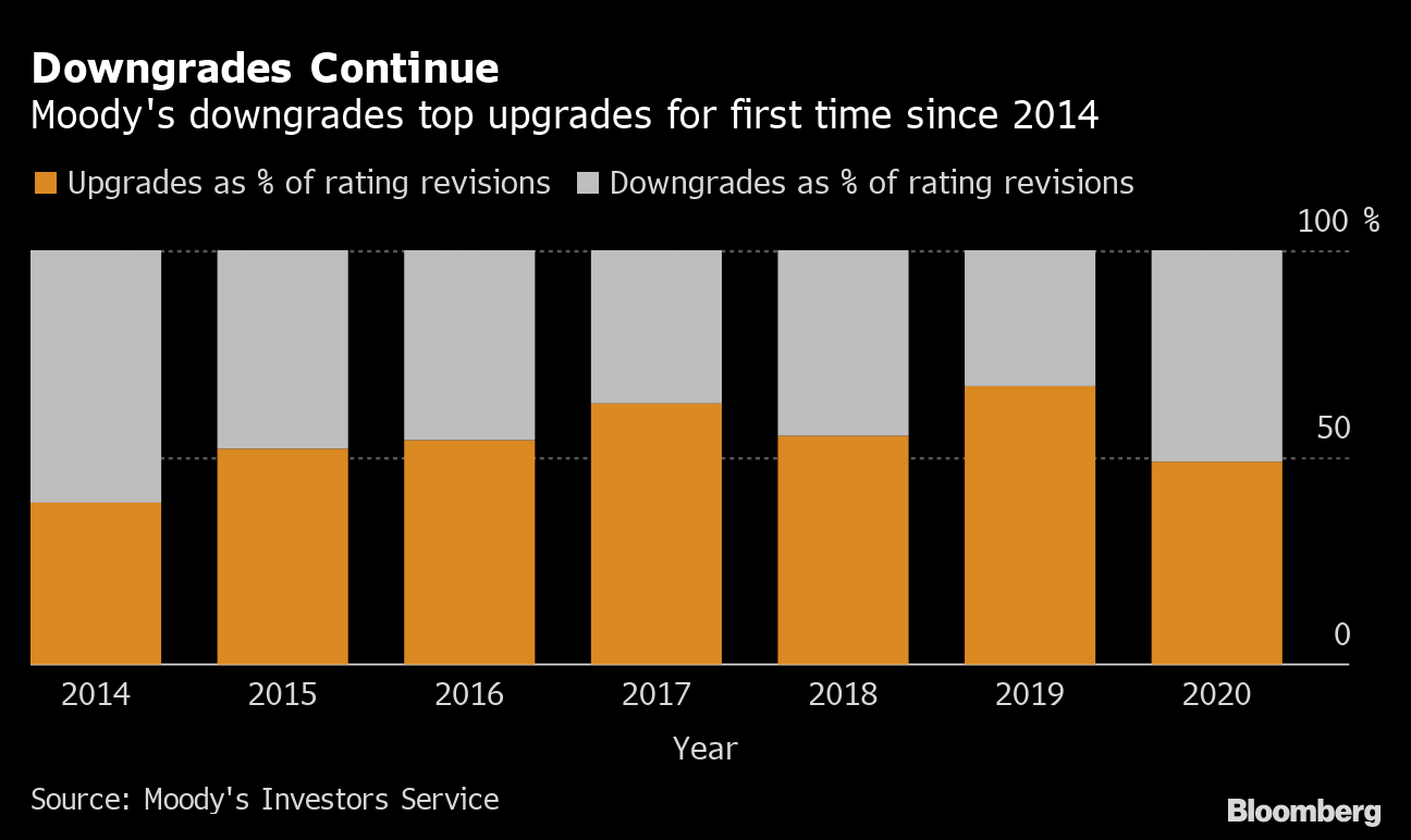 There were 309 downgrades compared with 296 upgrades in 2020, Moody’s said in an emailed report. The cuts affected $215.2 billion, or about 84% of the total debt affected by rating changes last year. About $42.1 billion of debt saw higher ratings, according to the report.