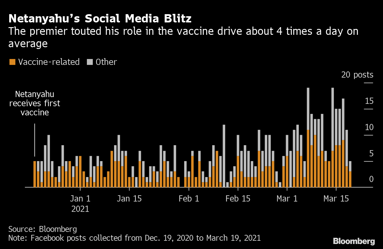 Israel’s economy has largely reopened, almost half the population has been fully inoculated, and Covid-19 cases continue to drop. So it’s little surprise Netanyahu chose to focus on his leadership of the vaccine drive in more than half of 608 Facebook posts in the three months since elections were called. Less welcome news like an unemployment rate of 18% and Iran’s accelerating nuclear program hasn’t got much of a mention.