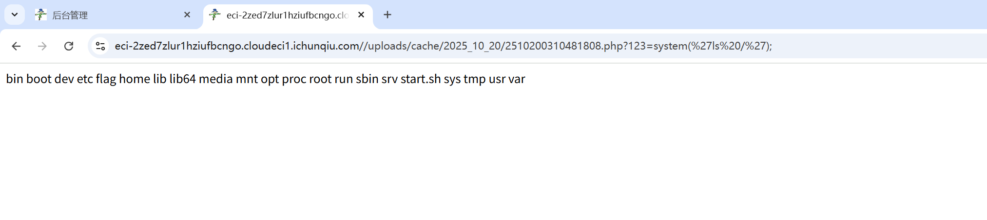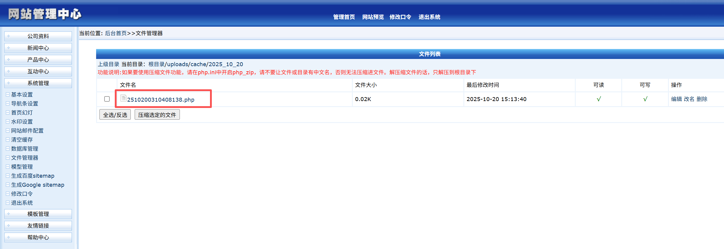 然后在系统管理-文件管理器-uploads-cache-2025_10_20-2310270510021439.php,可以看到上传的一句话木马