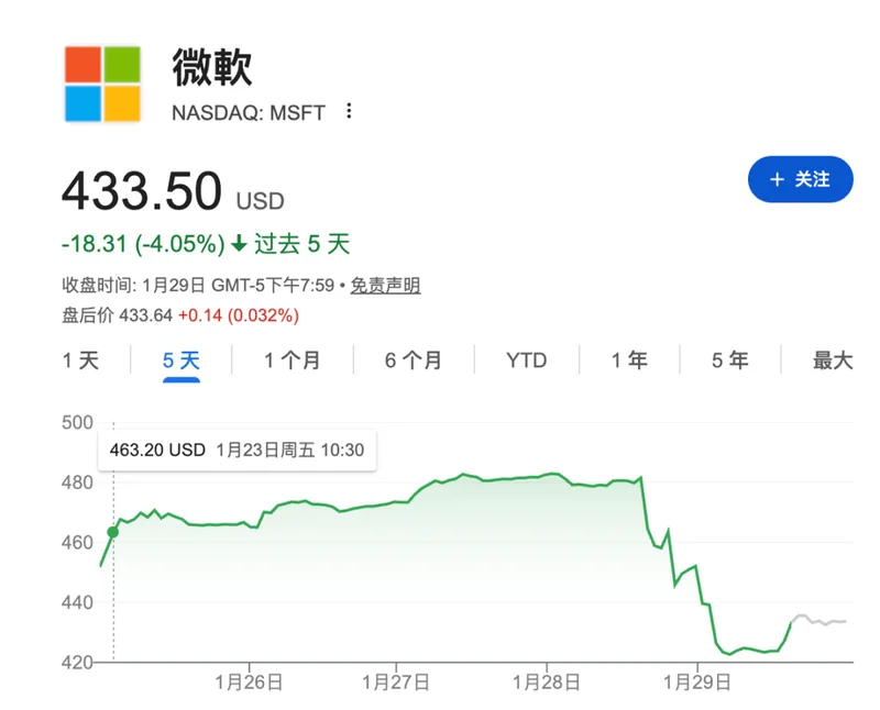 财报发出后,微软股价一度暴跌 10%。