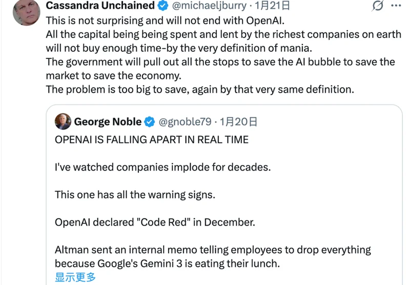 《大空头》的原型人物迈克尔·布瑞 (Michale Burry) 转发了帖子,表示自己认为泡沫将会破裂,而由于 AI 已经和整个经济强绑定,政府将不得不出面救市,就像他在 2008 年经历过的那次一样。