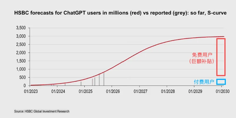 然而,去年汇丰对 OpenAI 的收入模型进行了分析,指出由于 AI 基础设施建设将在未来 5 年内对 OpenAI 造成至少 7920 亿美元的成本,OpenAI 需要在 2030 年初实现 30 亿周活跃用户,并且将付费用户比例提高到 10%,才能够避免“入不敷出”,甚至资金链断裂。