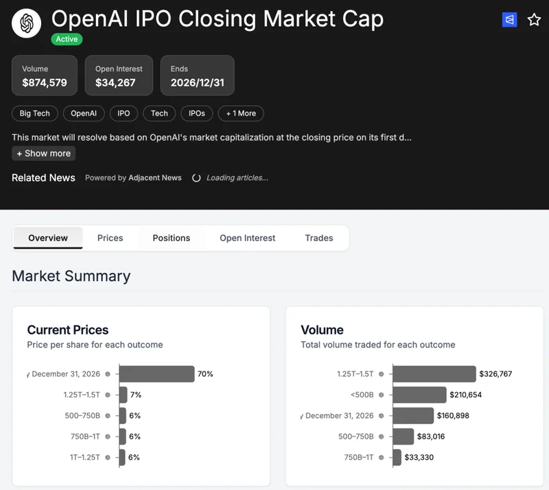 有人在为 OpenAI 上市时的市值下注,估值各不相同;也有人在赌政府是否会在今年 7 月之前出手救助 OpenAI;还有人押注 OpenAI 会在 2027 年前被其他公司收购。