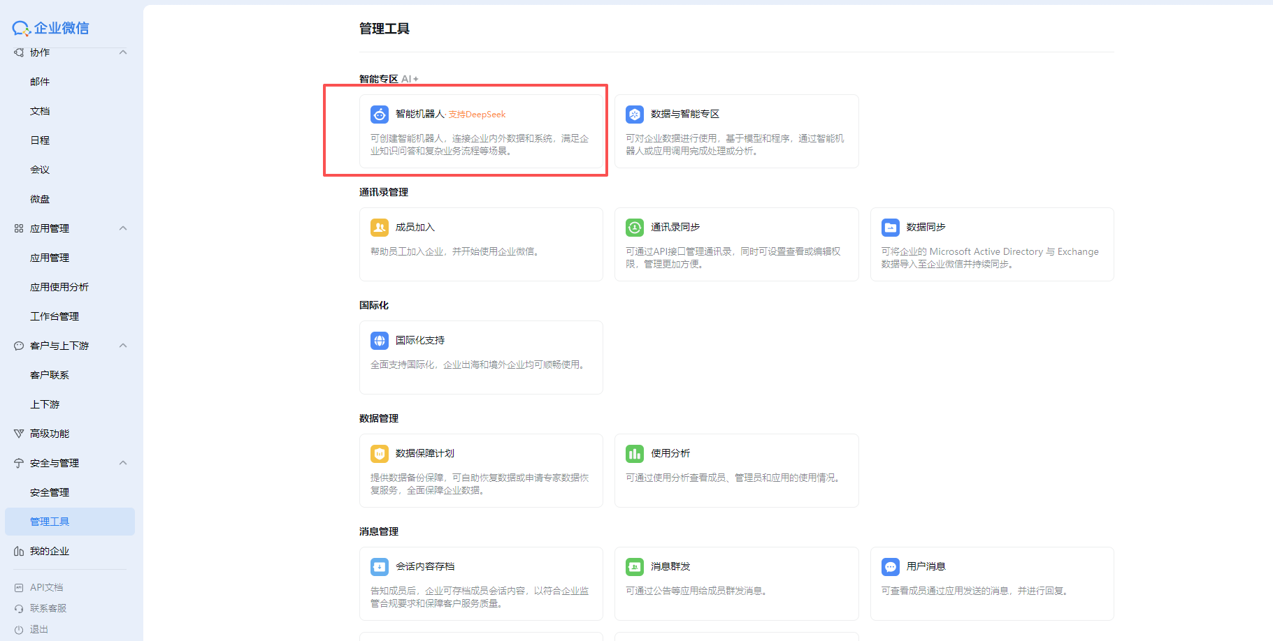 登录企业微信管理后台,左侧导航栏依次进入安全与管理 - 管理工具,在工具列表中找到「机器人」选项,点击进入后选择「创建机器人」。