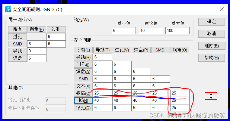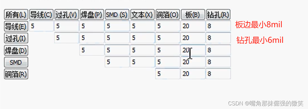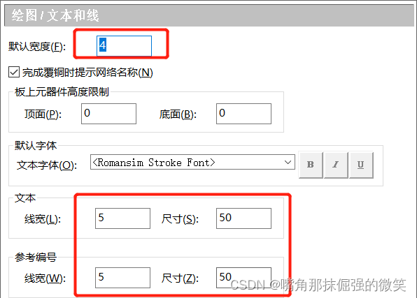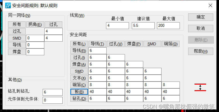 设置->设计规则->默认->安全间距->同一网络和其他设置为0,线宽根据需要设置,安全间距文本设置为0,铜箔到其他根据需要设置,板框到其他设置为20mil。可以参考下图设置。