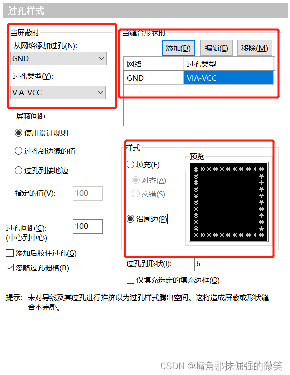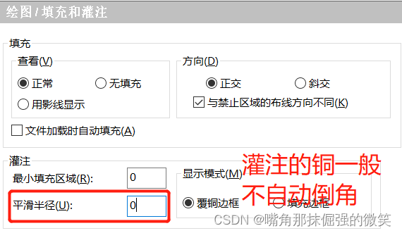 在铺铜时没有设置焊盘十字交叉的模式时,在铺铜时地过孔一般要求全覆盖(不是十字交叉的形式),选择要铺铜的形状->灌注与填充选项->过孔全覆盖