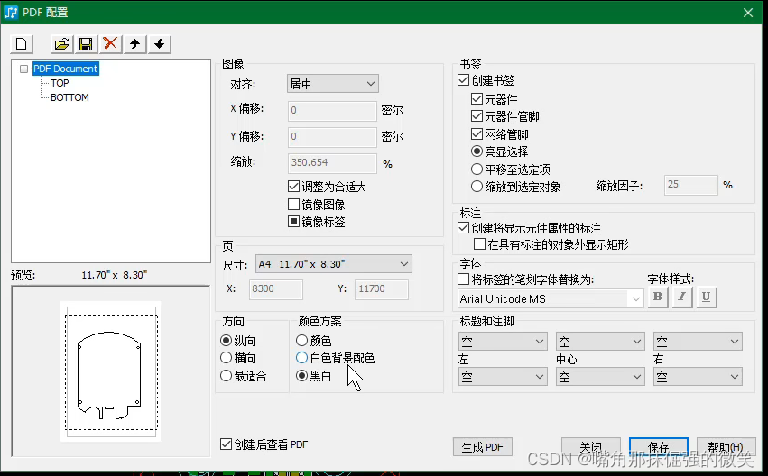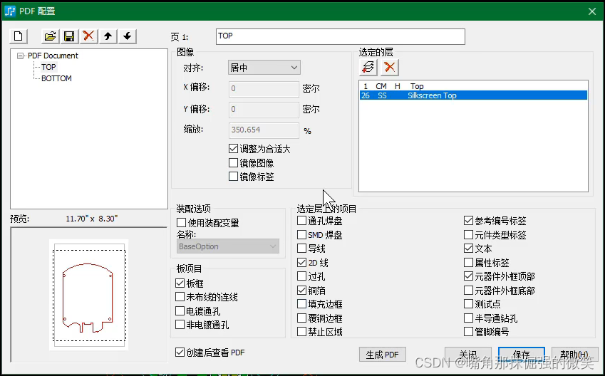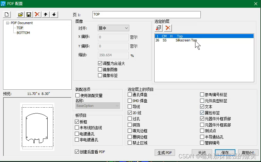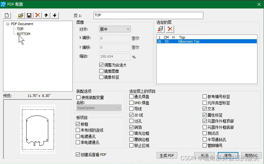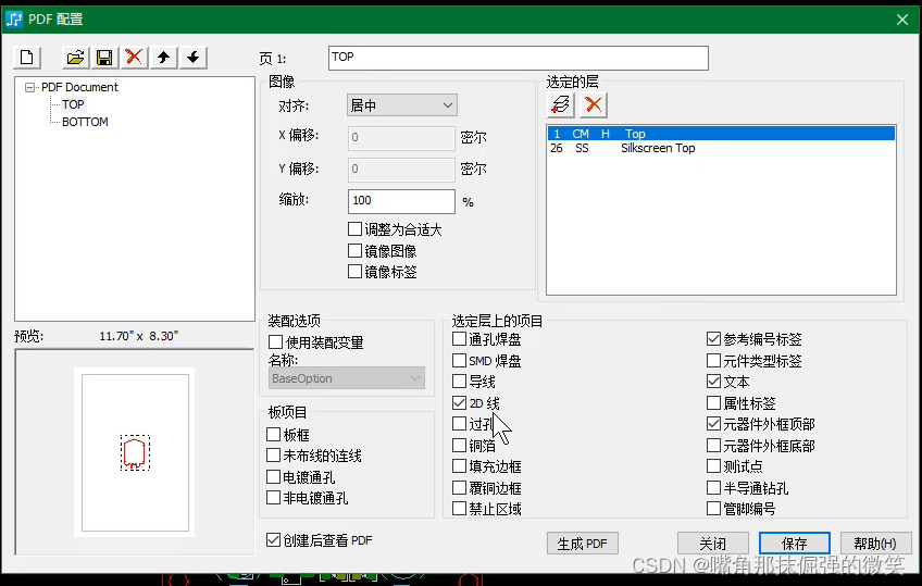 文件->生成PDF->新建两个页面->两个页面中分别添加顶层和顶层丝印层、底层和底层丝印层