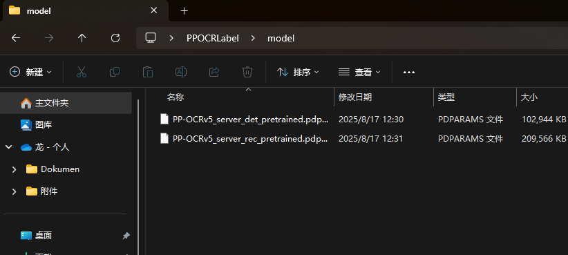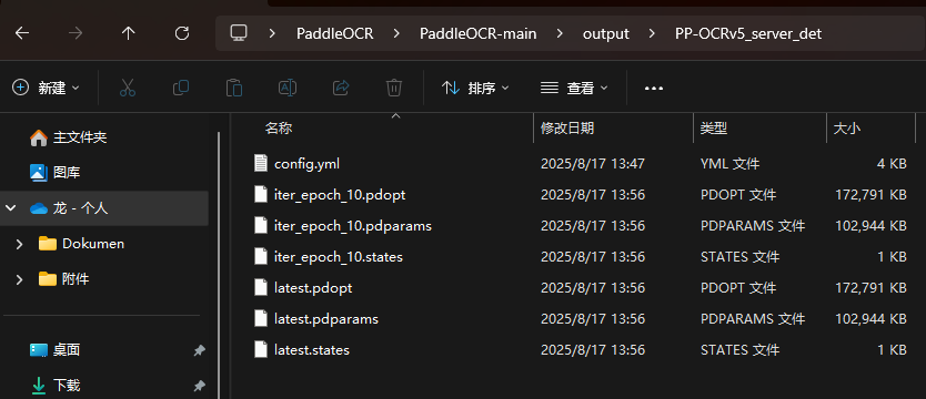 导出模型后,静态图模型会存放于当前目录的./PP-OCRv5_server_det_infer/中,在该目录下,您将看到如下文件: