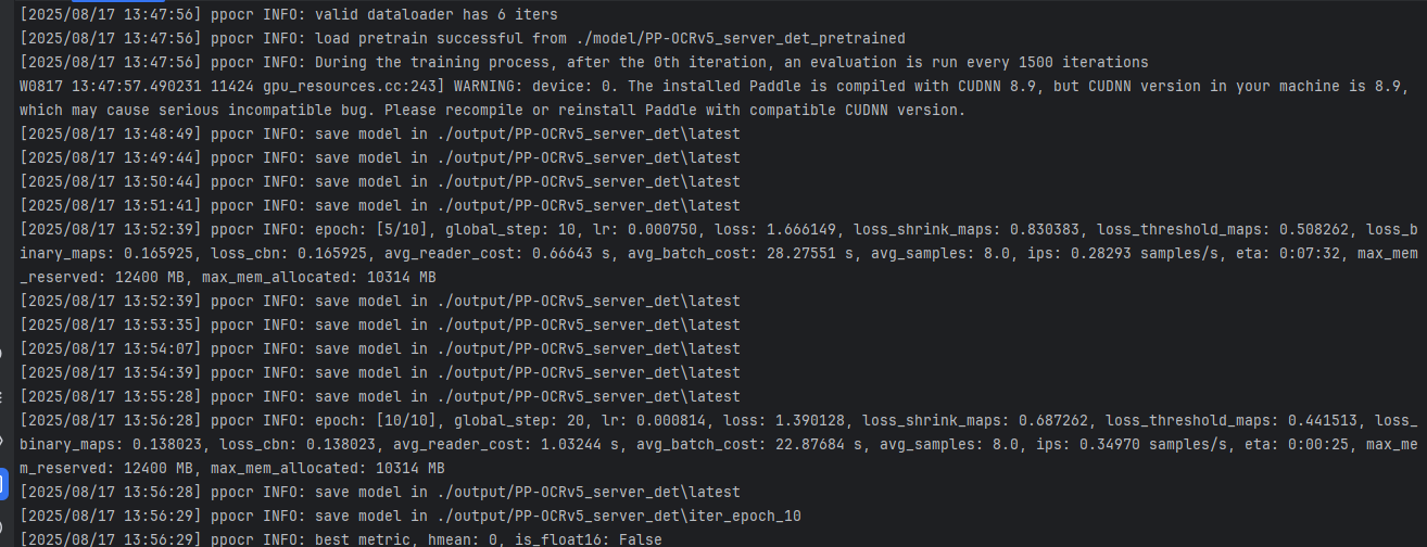 可以评估已经训练好的权重,如,output/PP-OCRv5_server_det/best_accuracy.pdprams,使用如下命令进行评估: