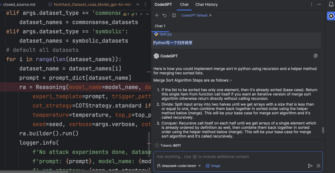 其次**,这种搭建方法是没有费用的**,推荐的方法包括Pycharm社区版,可以免费使用,deepseek-coder是开源的编程大模型,而CodeGPT插件也是免费。所以全都是免费的,并且没有附带费用。