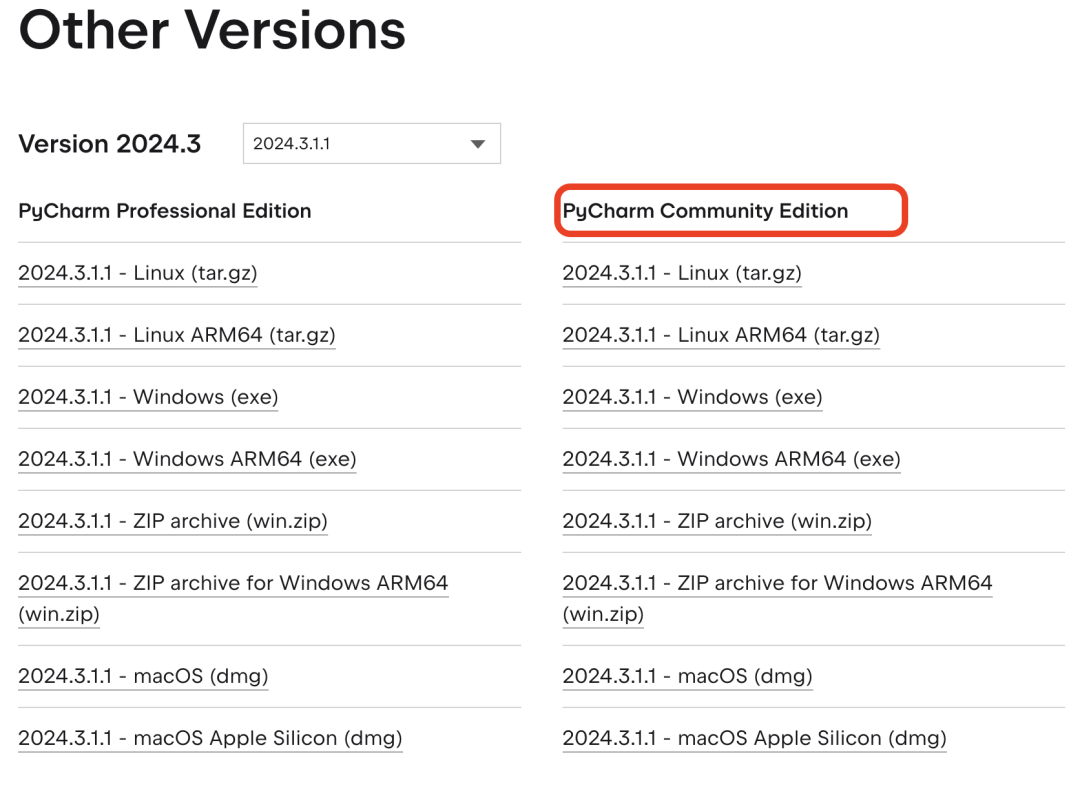 这个页面包括了Pycharm社区版最近几年的历史版本,推荐收藏。如下为下载软件页面部分截图: