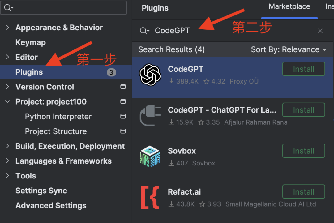 第三步,安装CodeGPT,安装它之后,可以直接在Pycharm或vscode里像GPT那样辅助编程了。因此,第三步是很关键的。