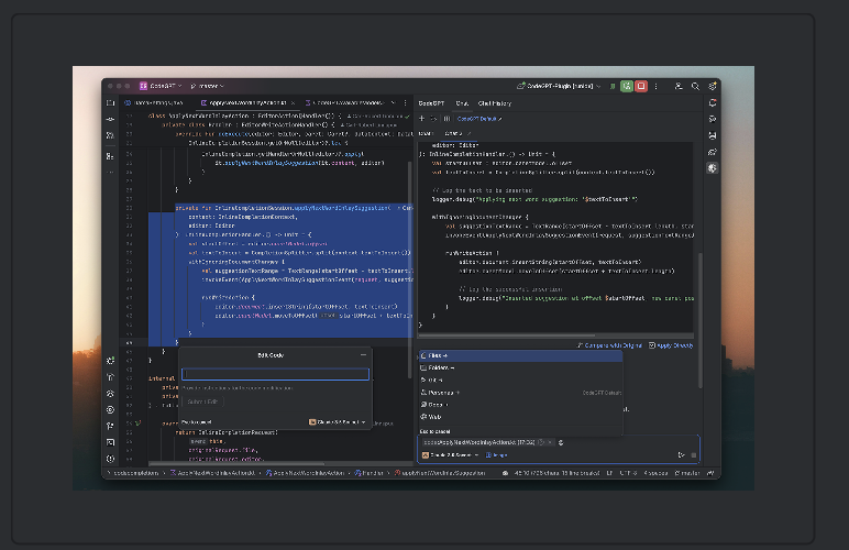 就出现下面这个页面,在右侧我们就可以使用大模型对话界面一样,使用它解决编程问题了,这种方式不用拉回倒腾页面,会比较方便: