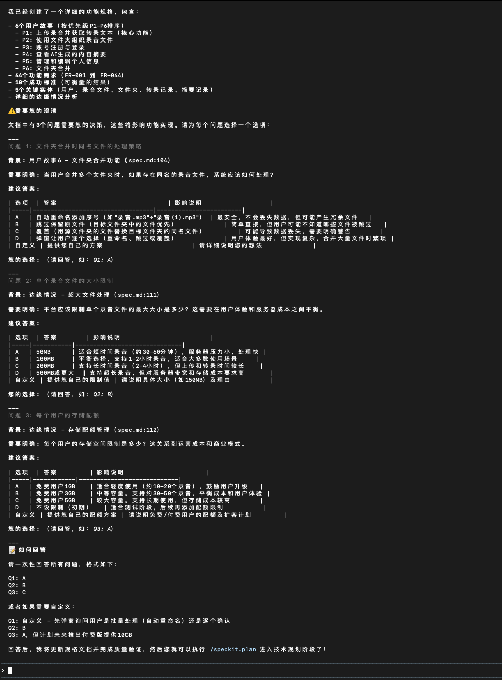 复制进去命令行,点击回车,就会继续生成需求文档,最后,会有让你确认的一下点