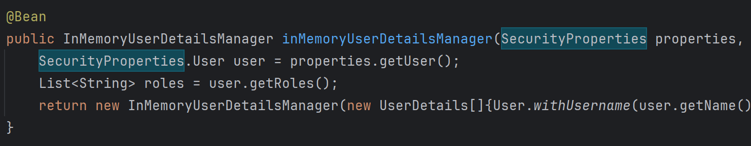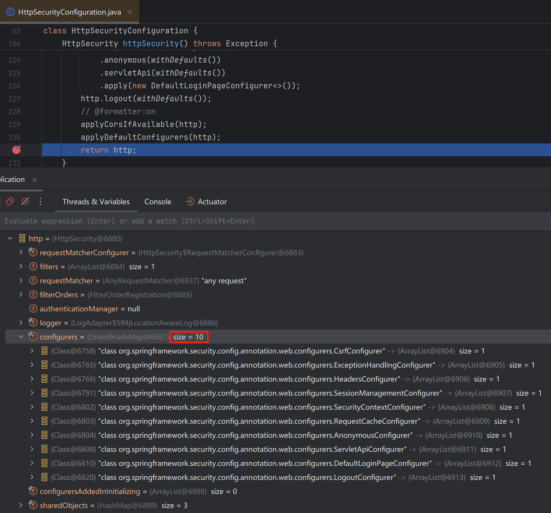 @Configuration(proxyBeanMethods = false) @ConditionalOnWebApplication(type = Type.SERVLET) class SpringBootWebSecurityConfiguration { @Configuration(proxyBeanMethods = false) @ConditionalOnDefaultWebSecurity static class SecurityFilterChainConfiguration { @Bean @Order(SecurityProperties.BASIC_AUTH_ORDER) SecurityFilterChain defaultSecurityFilterChain(HttpSecurity http) throws Exception { // 加入 AuthorizeHttpRequestsConfigurer http.authorizeHttpRequests((requests) -> requests.anyRequest().authenticated()); // 加入 FormLoginConfigurer http.formLogin(withDefaults()); // 加入 HttpBasicConfigurer http.httpBasic(withDefaults()); // 到此,13个 Configurer 加入结束 return http.build(); } } }