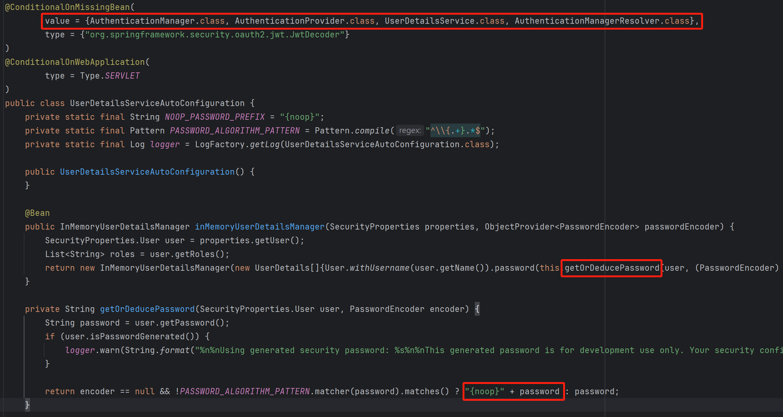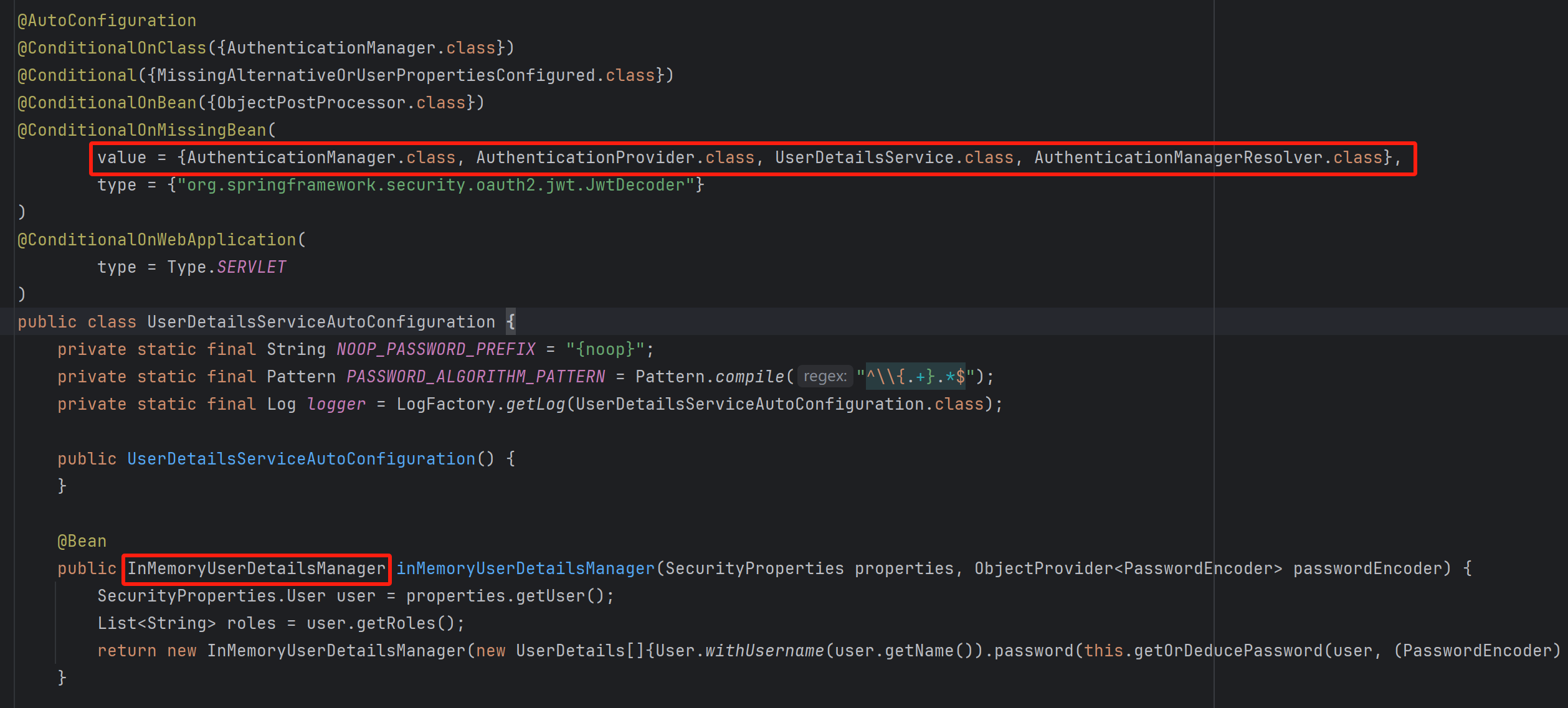 @Configuration(proxyBeanMethods = false) @ConditionalOnWebApplication(type = Type.SERVLET) class SpringBootWebSecurityConfiguration { @Configuration(proxyBeanMethods = false) // 注意这个条件注解 @ConditionalOnDefaultWebSecurity static class SecurityFilterChainConfiguration { @Bean @Order(SecurityProperties.BASIC_AUTH_ORDER) SecurityFilterChain defaultSecurityFilterChain(HttpSecurity http) throws Exception { http.authorizeHttpRequests((requests) -> requests.anyRequest().authenticated()); http.formLogin(withDefaults()); http.httpBasic(withDefaults()); // 生成 DefaultSecurityFilterChain return http.build(); } } }请注意 @ConditionalOnDefaultWebSecurity 这个条件注解: