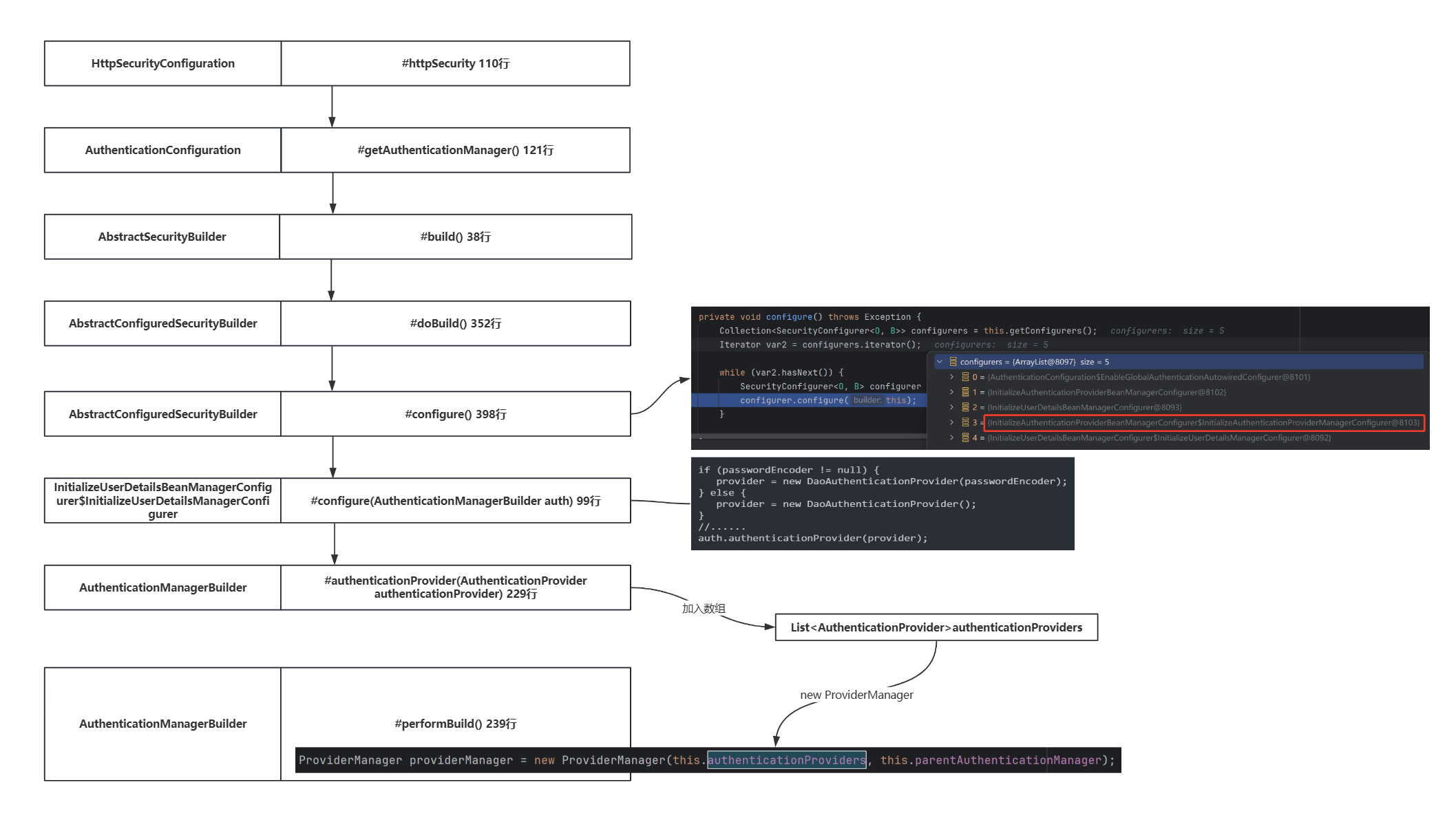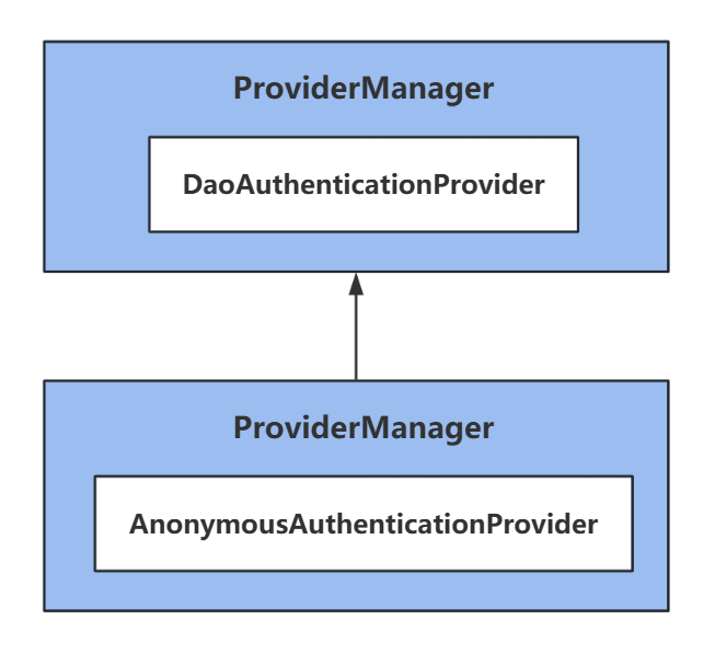 - 接下来,UsernamePasswordAuthenticationToken 被传递到 AuthenticationManager 实例ProviderManager#authenticate 中进行身份验证。AuthenticationManager 的处理细节取决于用户信息的存储方式(即 Authentication 的类型。比如,UsernamePasswordAuthenticationToken 由 ProviderManager 委托给DaoAuthenticationProvider 处理,AnonymousAuthenticationToken 委托给 AnonymousAuthenticationProvider 处理,用户也可以自己定义一个 QRCodeAuthenticationToken 表示二维码认证信息,再自己定义一个 QRCodeAuthenticationProvider 来处理)。