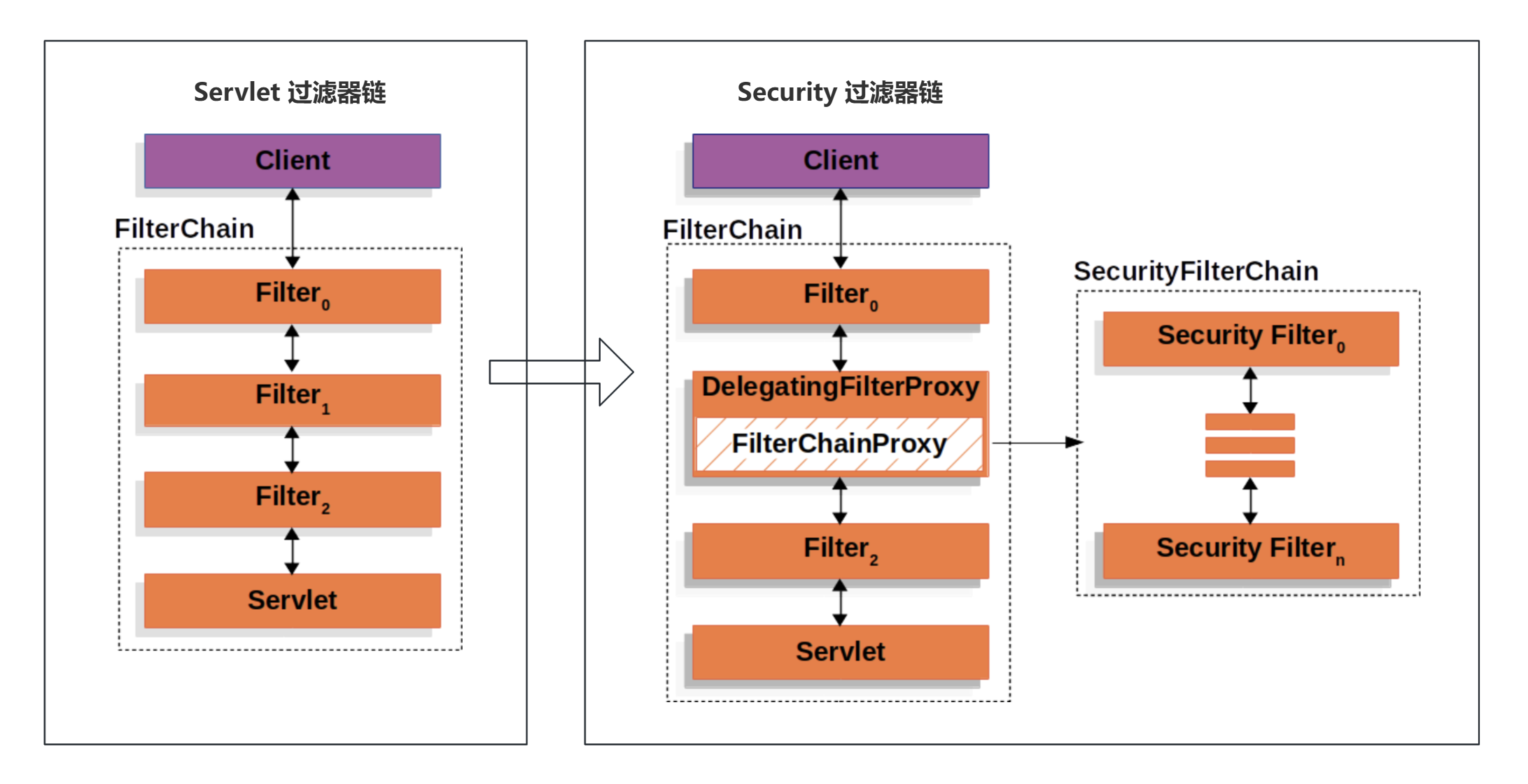 左边是传统的 Servlet 过滤器链 FilterChain,右边是 Spring Security 实现的过滤器链 SecurityFilterChain。