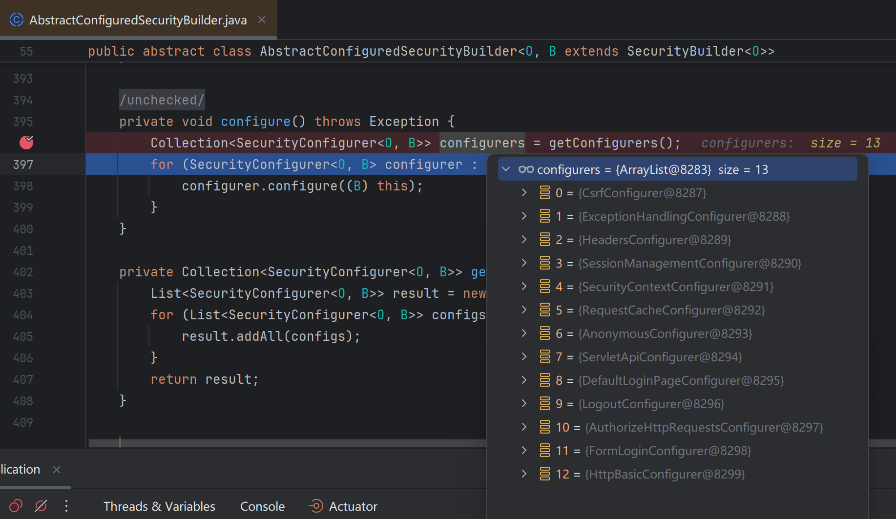 在 SpringBootWebSecurityConfiguration 生成 SecurityFilterChain 实例的时候,会调用 HttpSecurity 的 build 方法,挨个调用 Configurer 生成 13 个 Filter,加入到 HttpSecurity 的 List<OrderedFilter> filters 里面。