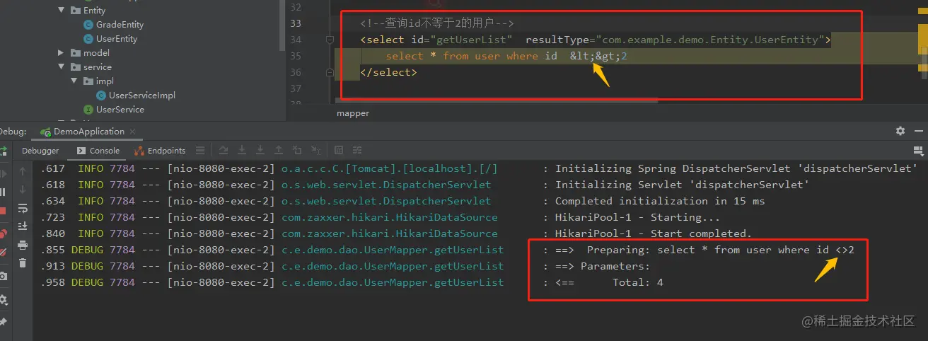 如上执行sql打印结果与要执行的sql执行逻辑一致,说明转义成功了。再举例一个不等于 的sql吧,大家请看。