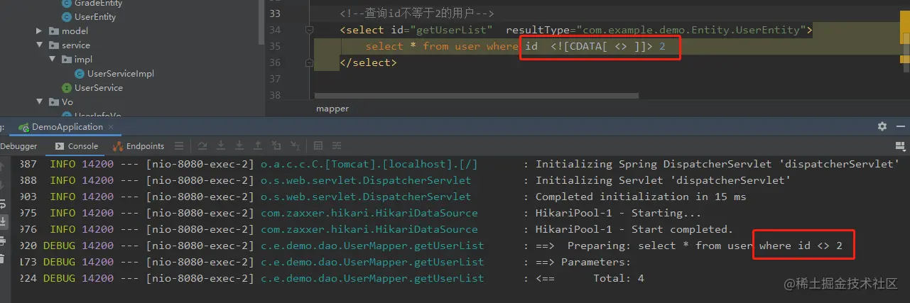 select * from user where id <![CDATA[ <> ]]> 2