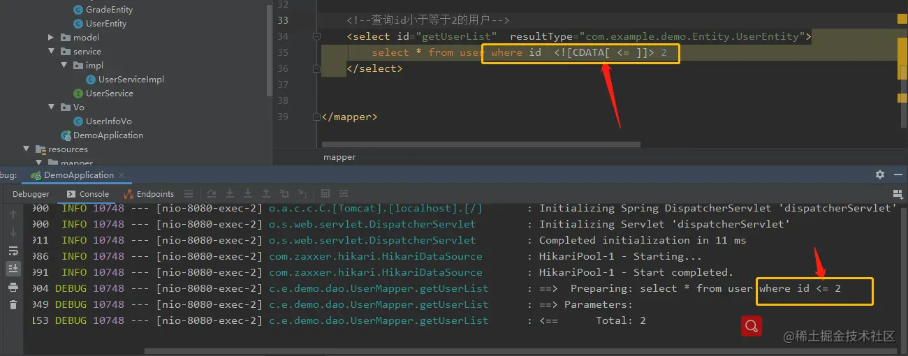 select * from user where id <![CDATA[ <= ]]> 2