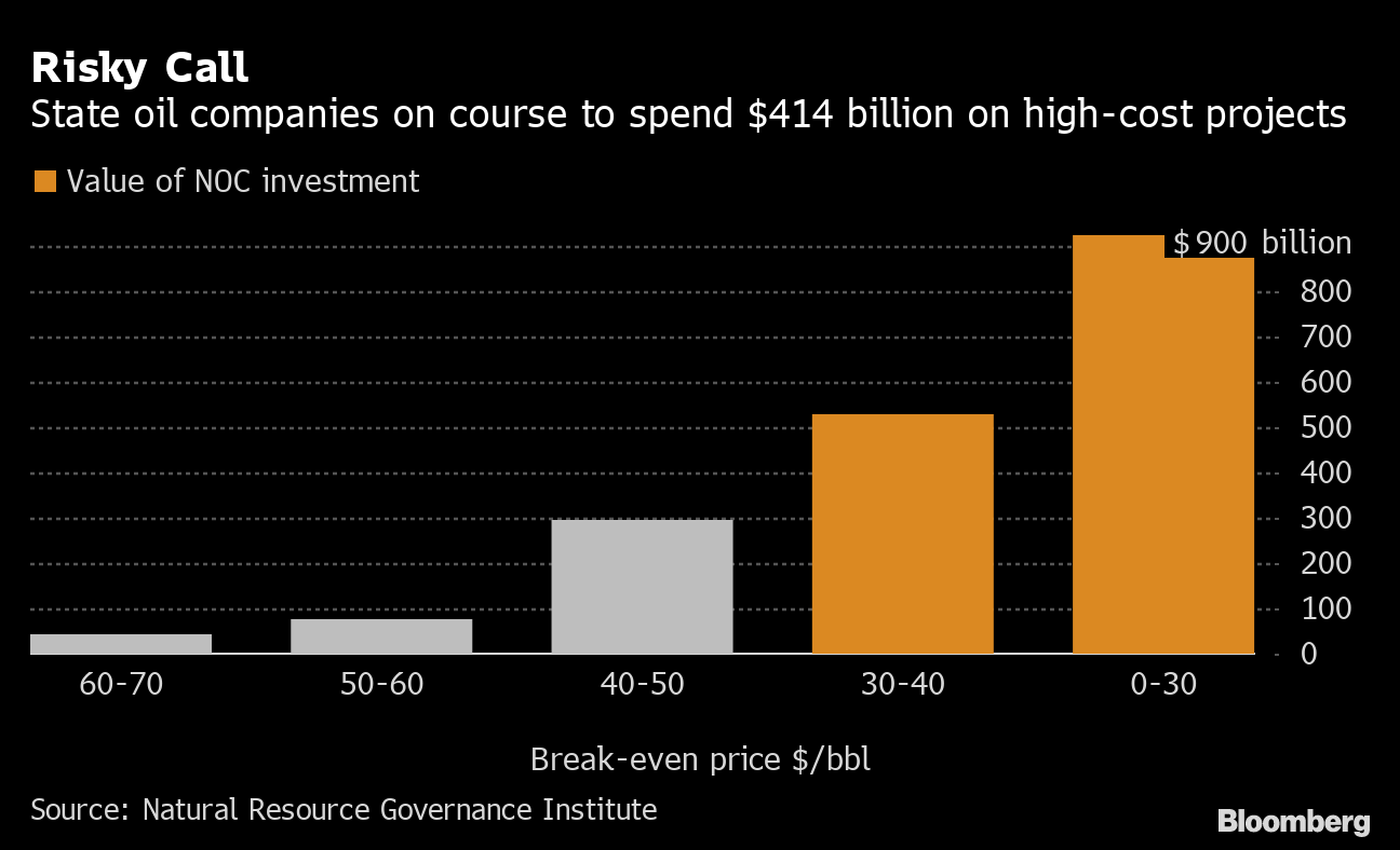 NOCs are on course to spend $414 billion over the next decade on such projects, the Natural Resource Governance Institute said in a report. About $295 billion of that investment needs a long-term oil price of at least $40 a barrel to break even, while the remainder requires $50 to $70.