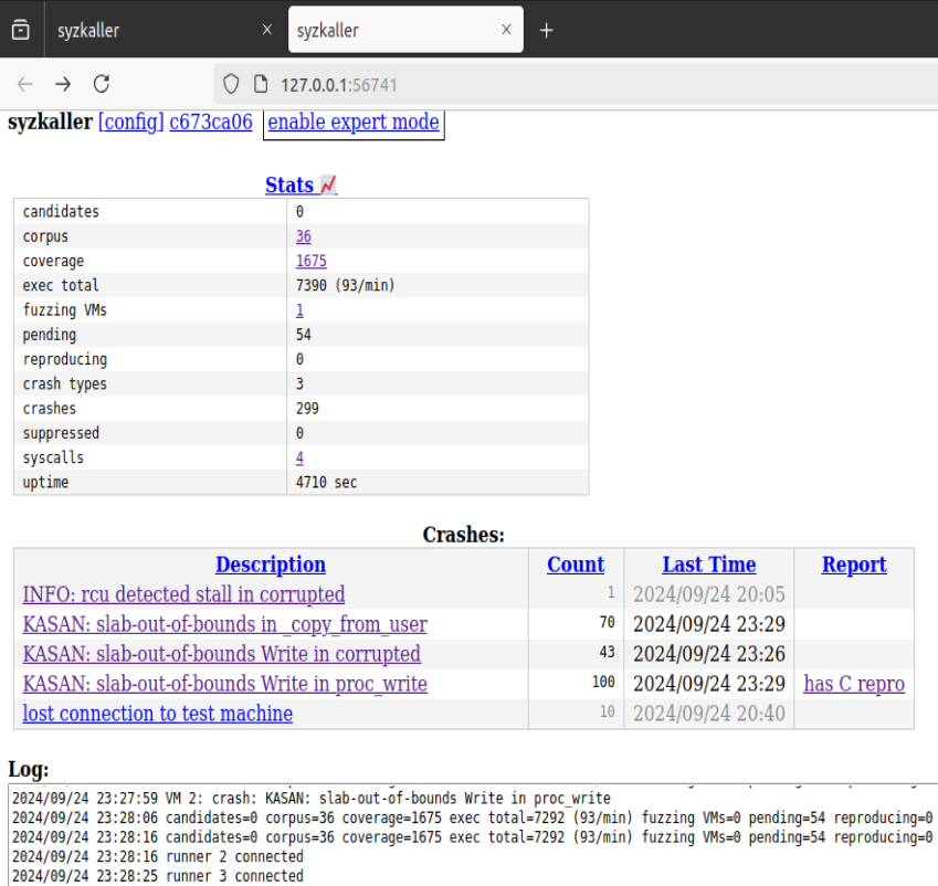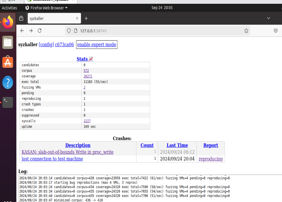 启动syzkaller,开始fuzz。