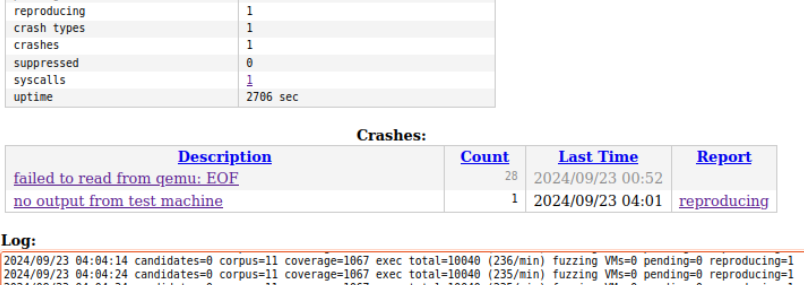 running: reproducing:如果发现了潜在的漏洞,Syzkaller 会将虚拟机置于重现模式,尝试重现该漏洞