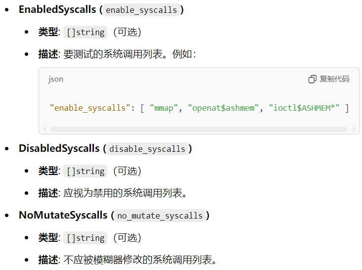 为了更快看到crash结果,增加了“enable_syscalls”项,只允许某些系统调用,能更快地触发漏洞。