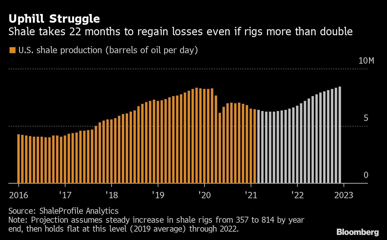 That’s still a big “if,” one that’s keeping the oil market on edge as crude’s rally makes it more tempting for shale producers to go back on their word. But the U.S. shale patch is showing little sign of a true comeback so far, and even a dramatic boost in activity would leave oil output below pre-pandemic levels until late next year. Drillers that have shown signs of straying from the script and boosting production have been punished by investors.