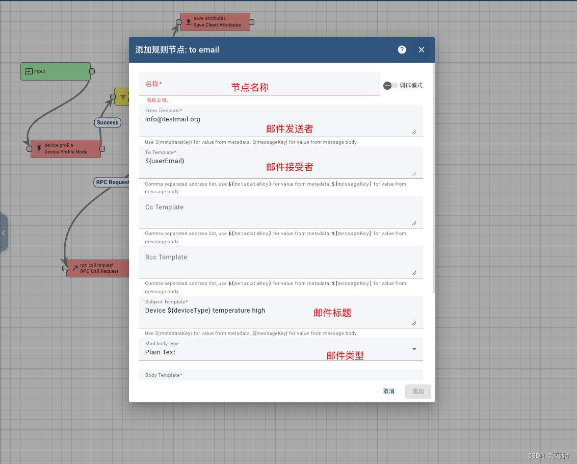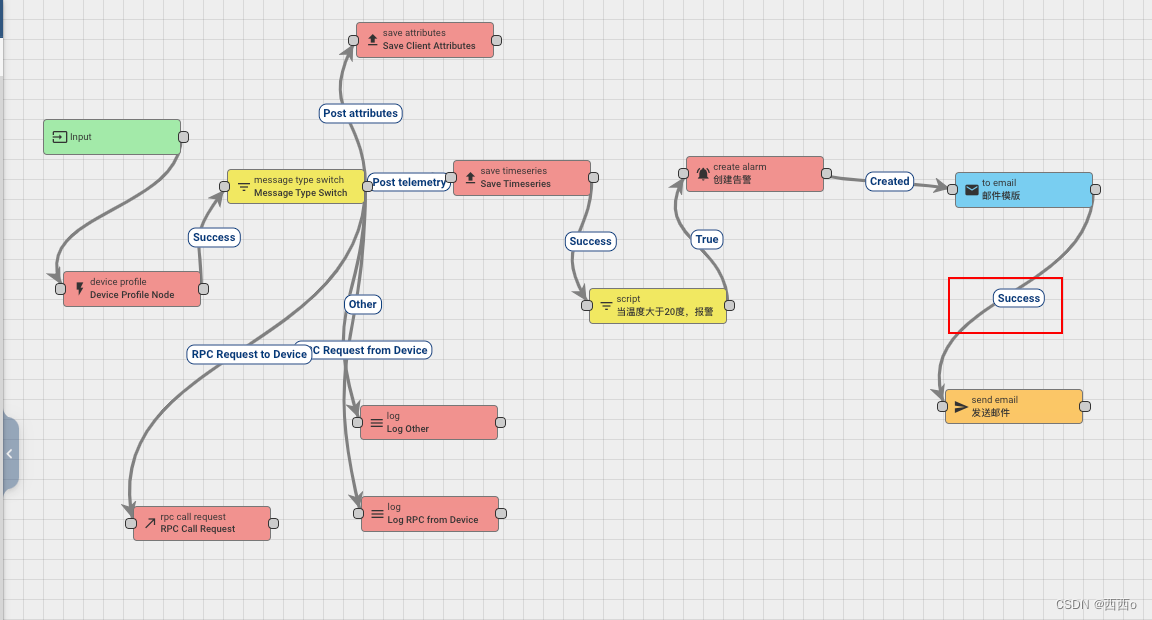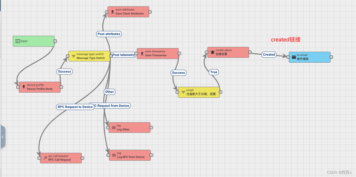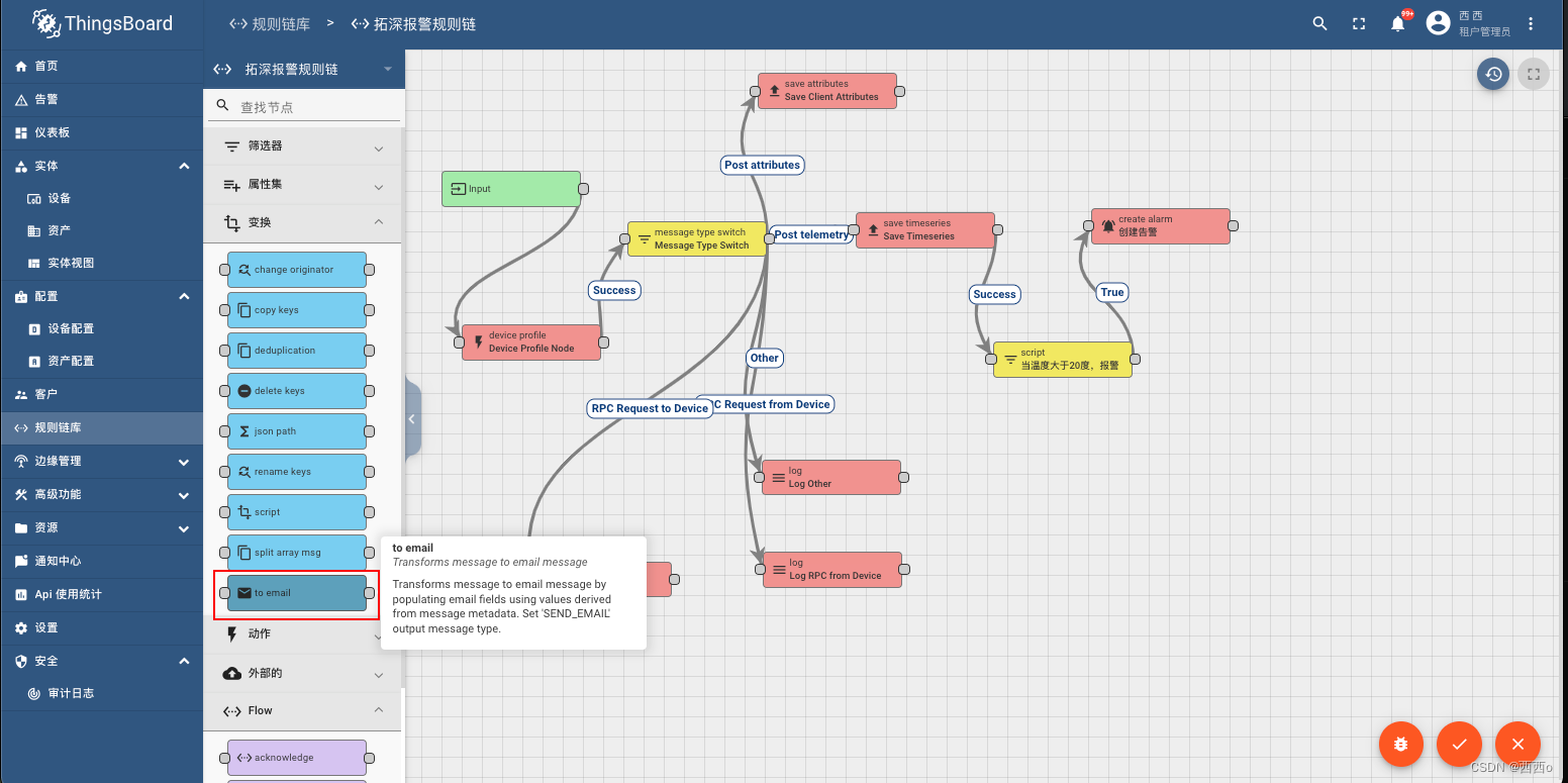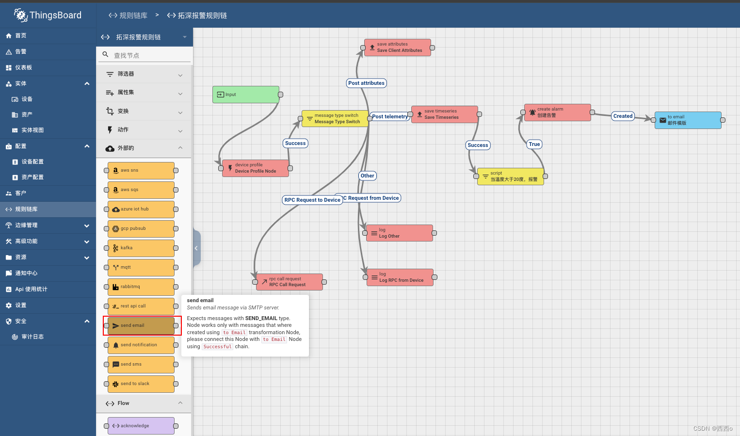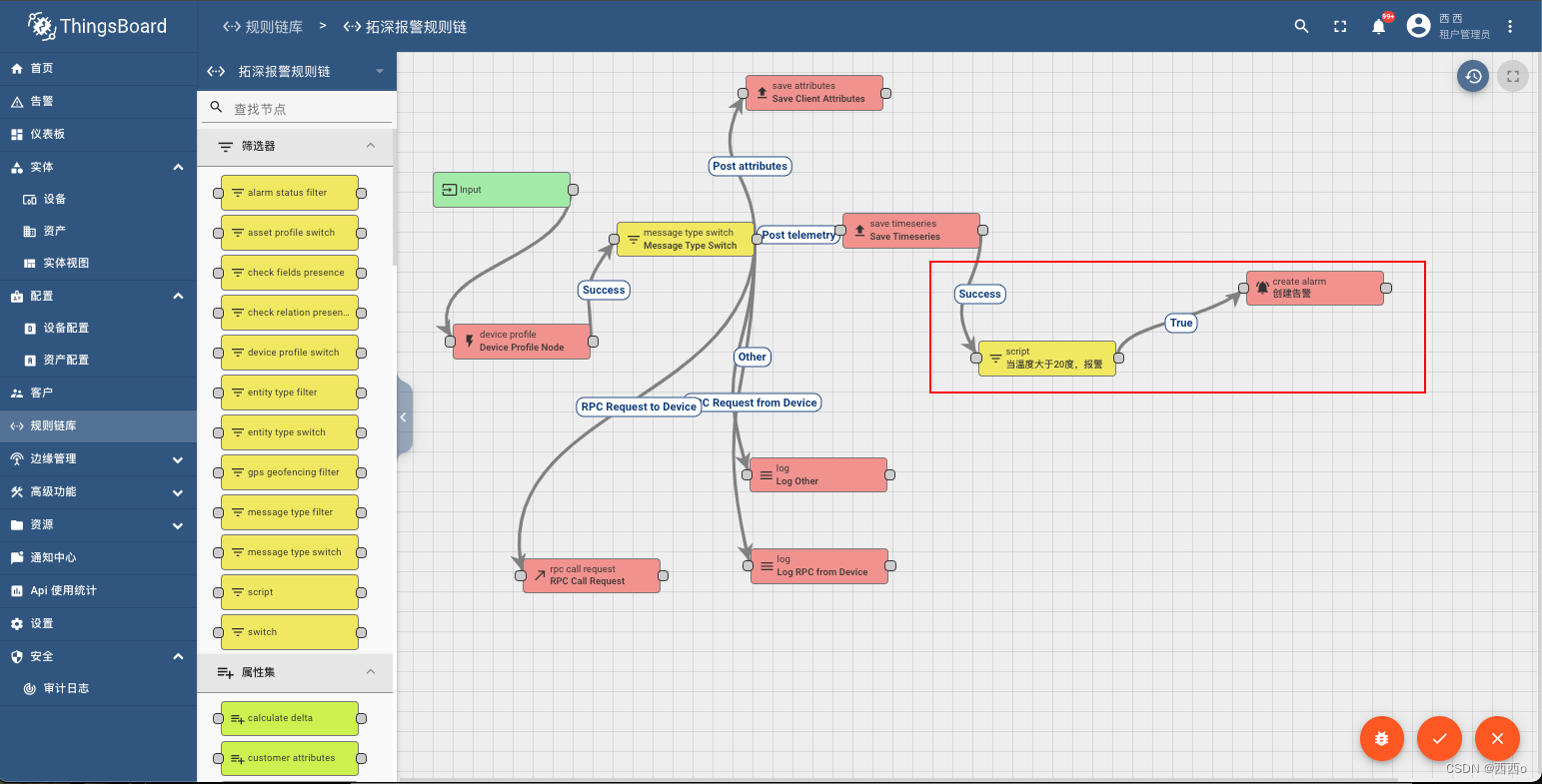 当前链路为最基础的链路,使用script节点来判断,当温度大于20度时,发生报警