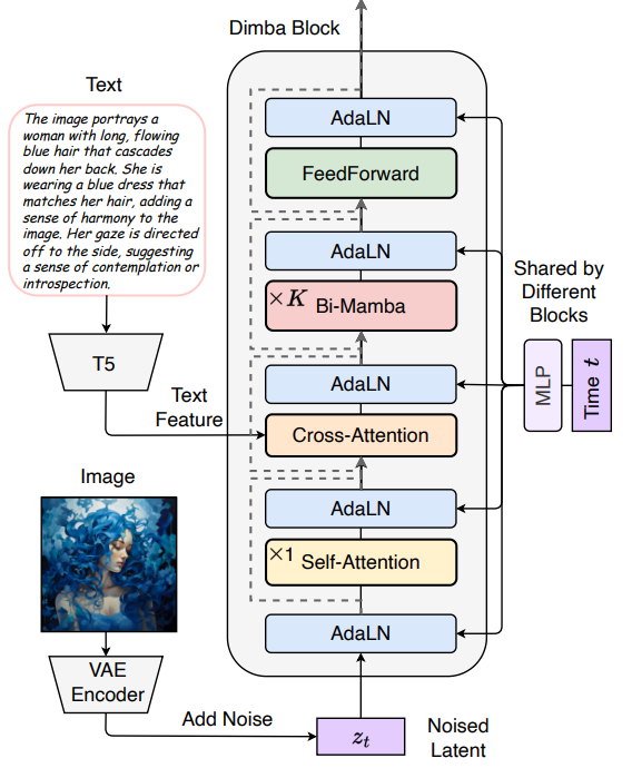 引入了一个新的文本到图像扩散模型,采用了Transformer和Mamba元素的混合架构。Dimba模型通过在Transformer和Mamba层之间交替堆叠块,并通过交叉注意力层整合条件信息,充分发挥了两种架构范式的优势。