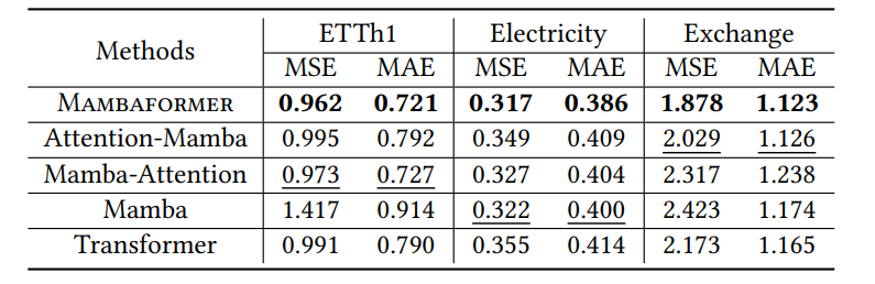 作者提出了一种混合架构,该架构结合了Mamba和Transformer模型以进行时间序列预测。
