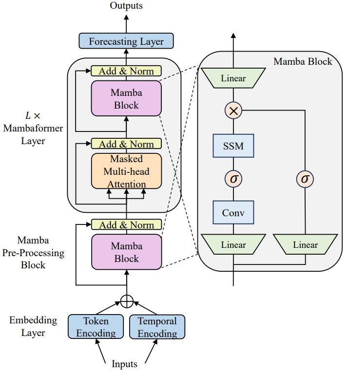 核心的Mambaformer层将Mamba层和自注意力层交替排列,以结合Mamba和Transformer的优点。注意力层捕获时间序列数据中的短期依赖性,而Mamba层则增强了捕获长期依赖性的能力。这一层显著提高了Mambaformer系列在长短时范围时间序列预测中的性能。