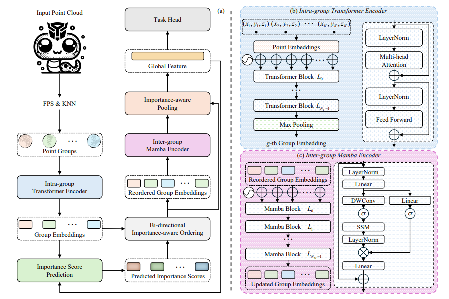 为了解决点云随机排序对Mamba性能的负面影响,作者引入了一种新的双向重要性感知排序策略。