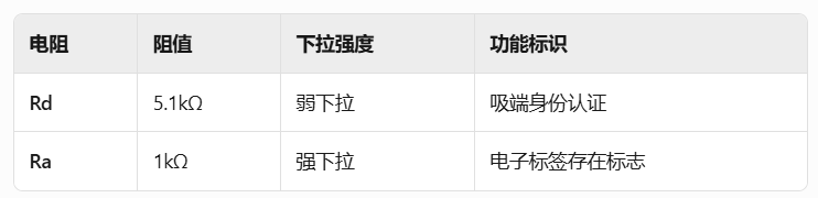 - 通过Rd下拉电阻(5.1kΩ)标识sink端身份