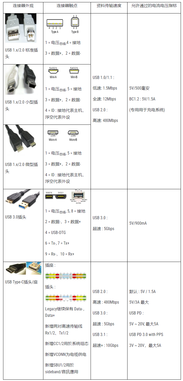 表1将旧有的USB标准和USB Type-C标准放在一起进行了比较。