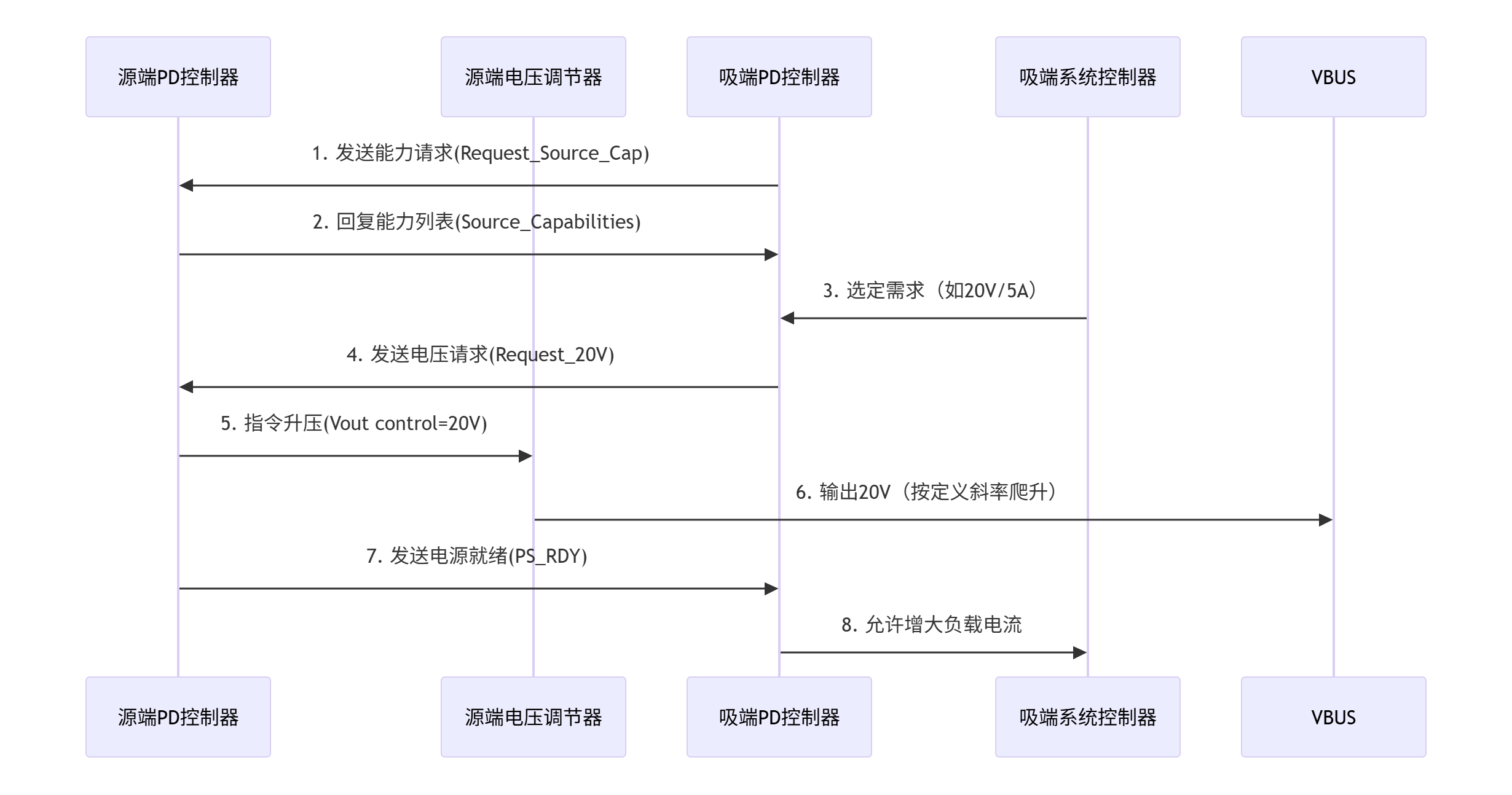 - 电压降低请求: 当sink端需要降低总线电压(例如设备进入待机或准备断开连接)时,会发起类似的通信过程(上述步骤3-5)。