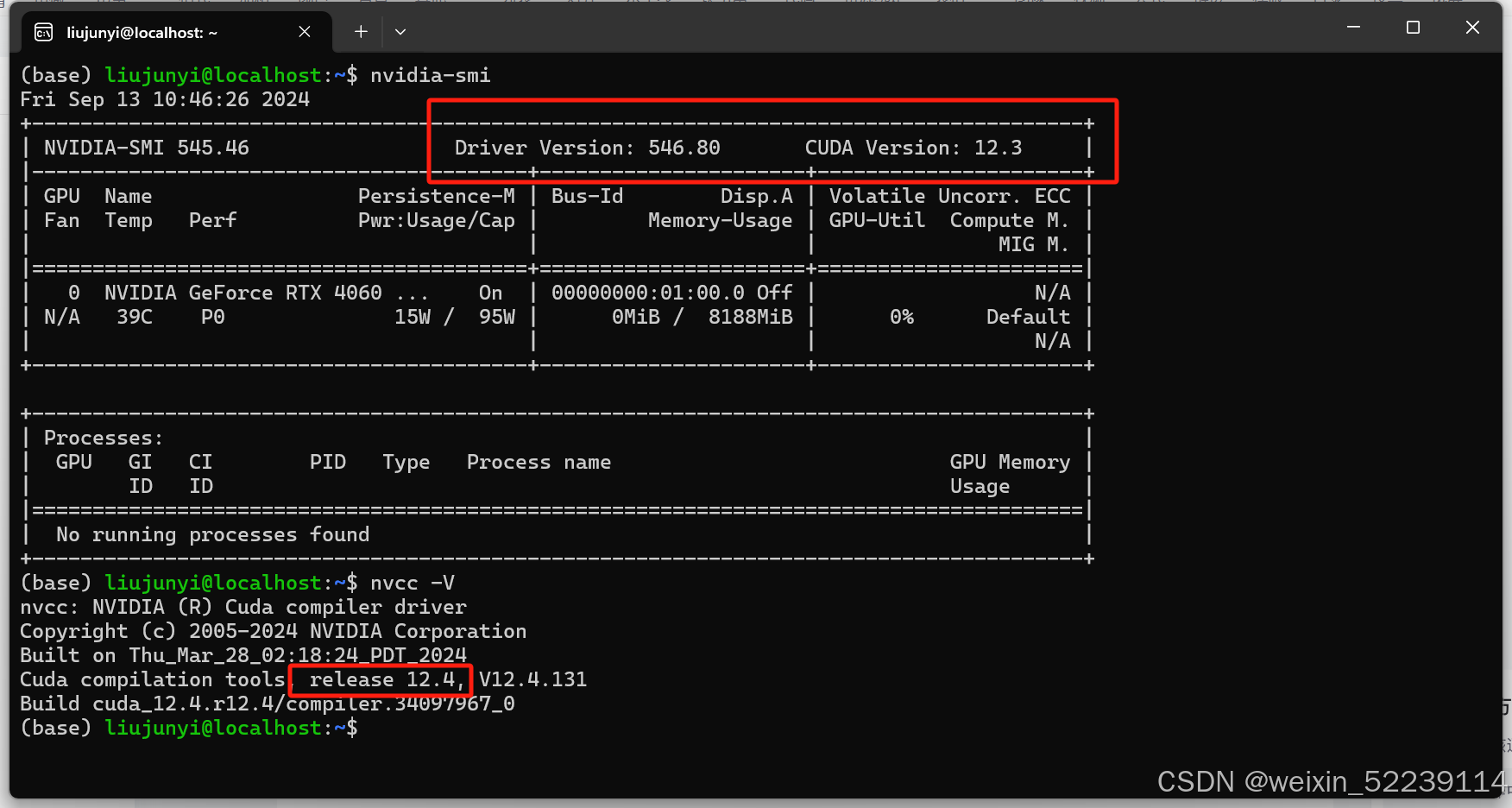 - 设备一:笔者自己的笔记本显卡是 RTX 4060ti,cuda版本是 12.3,nvcc版本是 12.4。