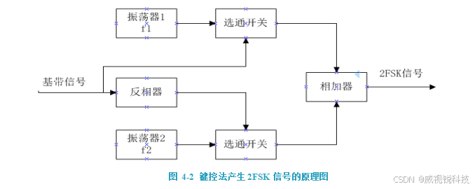 由图我们可以看出,一个2FSK信号可以看成是两个不同载频的2ASK信号的叠加。因此2FSK的时域表达式又可以写成: