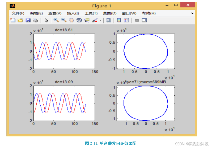 然后运行接收端程序rx_tcpip_test_adc.m。程序会将接收到的数据绘图并显示出来。可以看到单音信号的图形及其星座图。从图中可见两个通道均受到单音信号,以X-Y显示单音信号的星座图应是一个圆形。同时图中标题会显示matlab占用的运行内存和循环接收的次数。