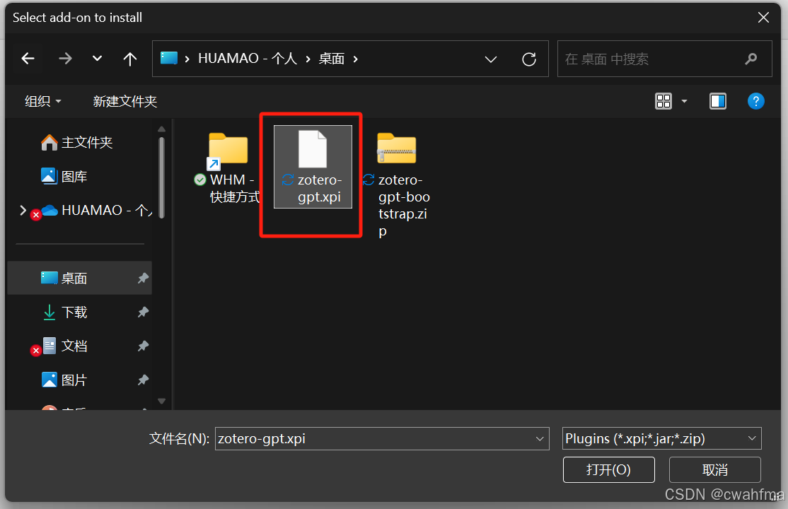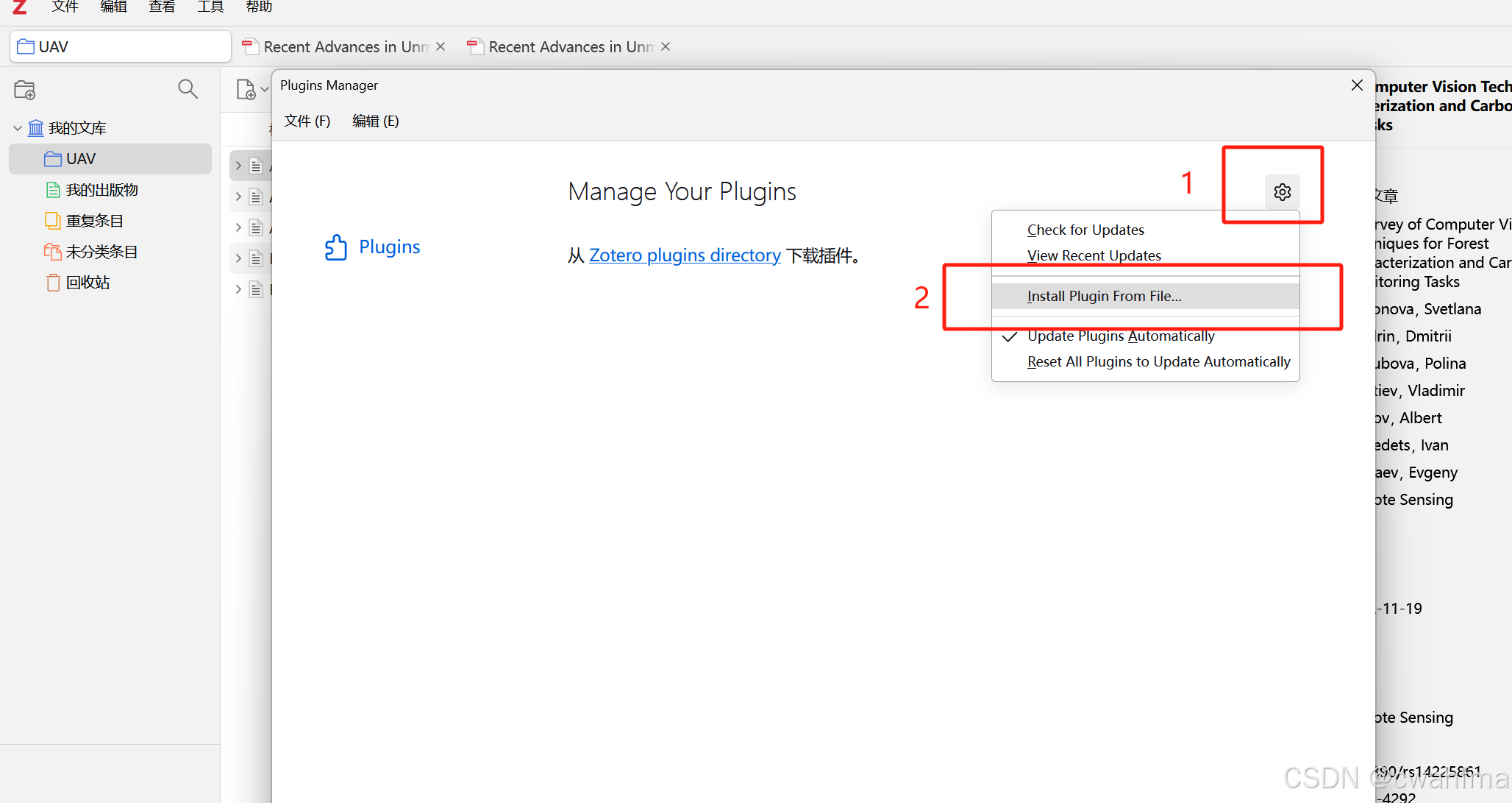 2.进入到插件页面,点击小齿轮,再选择Install Plugin From File...,选择刚才下载的zotero-gpt.xpi文件。