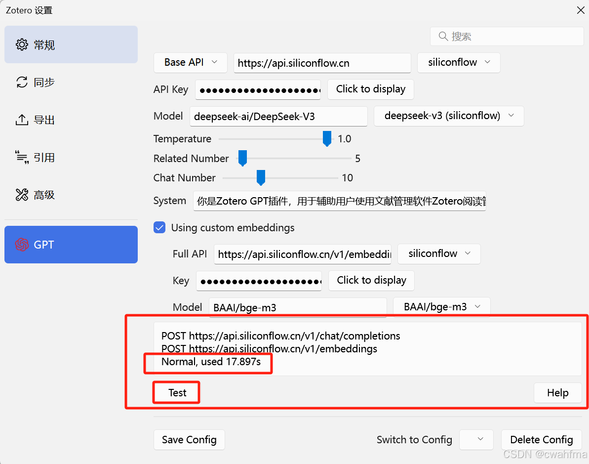 API配置好后,可以点击Test进行测试,若返回Normal说明调用成功;可能会受到网络影响加载速度会有点慢。