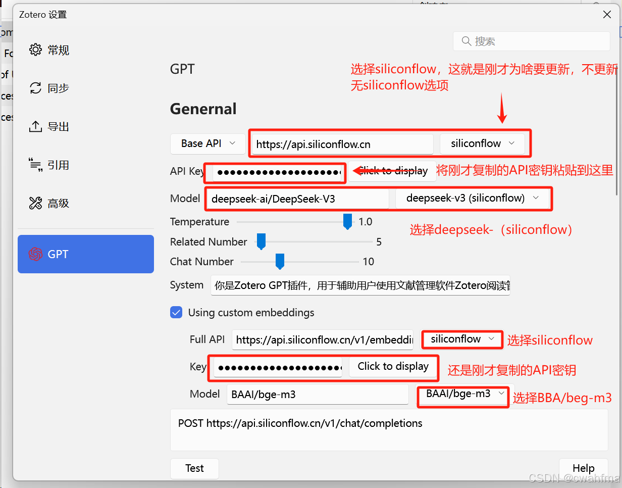 5.同样是将在硅基流动中复制的API密钥复制到插件GPT的Key 中;