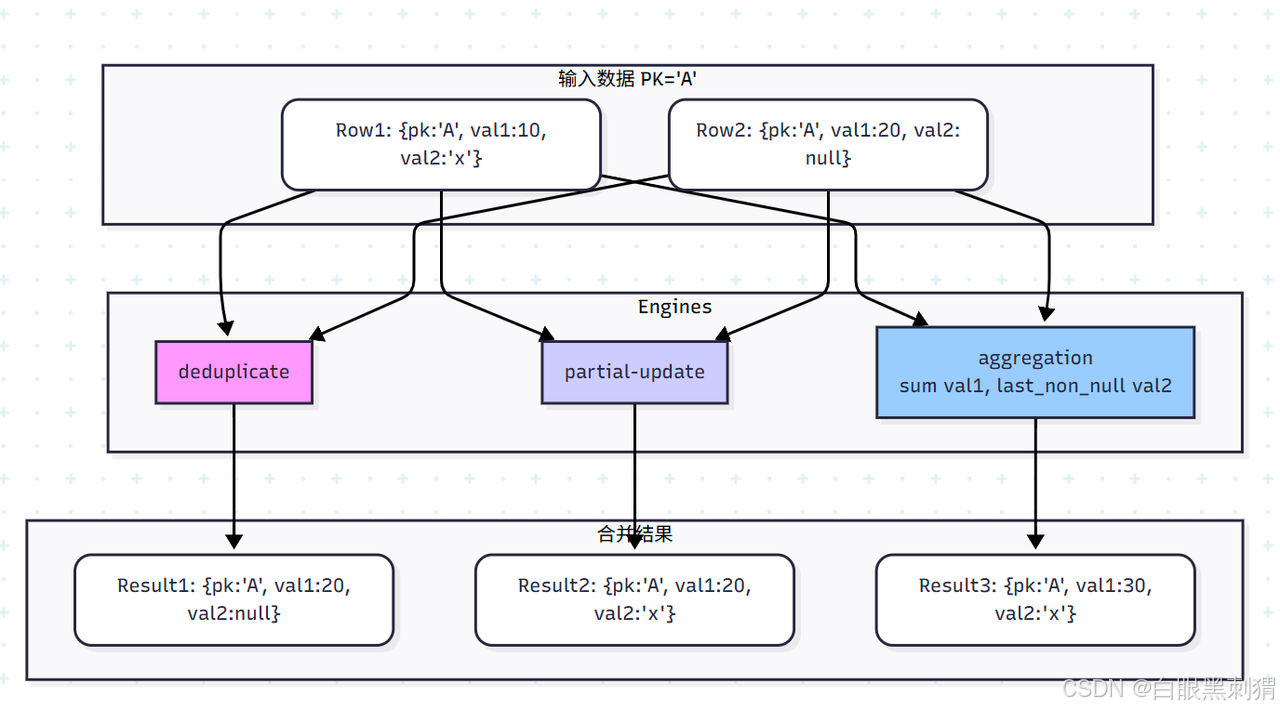 原理:这是最简单的引擎。对于相同主键的多条记录,它只会保留最新的一条。Paimon 内部通过一个序列号来判断新旧,序列号越大表示记录越新。