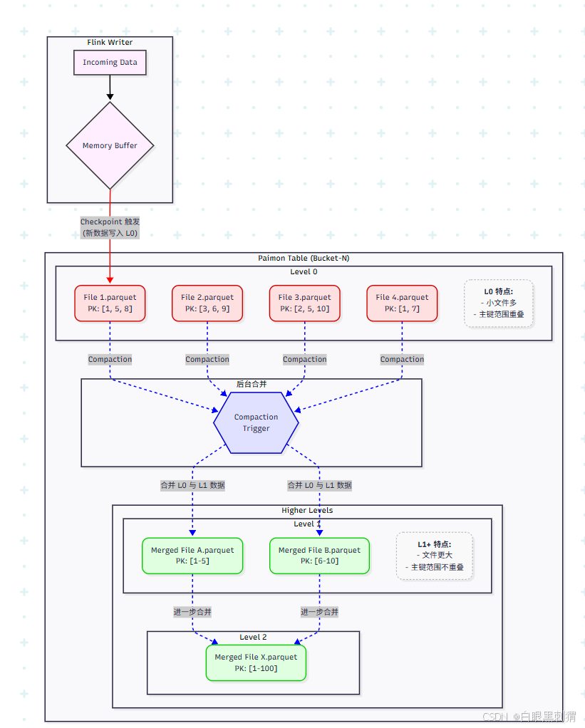 写入 (Write): Flink 作业持续不断地将数据写入 Paimon 表。每次 Checkpoint 成功后,内存中的数据会被刷写成一个新的数据文件,并放置在 L0。如图中所示,L0 中有多个文件,它们的主键范围是相互重叠的(比如