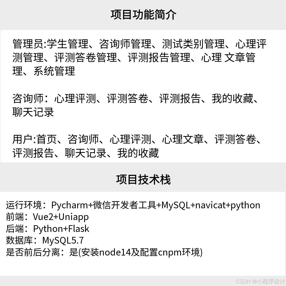 Python+Django/Flask作为后端语言,具备快速开发、丰富的心理学数据分析库(如Pandas、NumPy)等优势,适合处理心理测评数据统计和机器学习模型集成。Vue.js作为前端框架,能够构建响应式、用户友好的移动端界面,提升使用体验。微信小程序平台提供即用即走的轻量化入口,降低用户使用门槛。